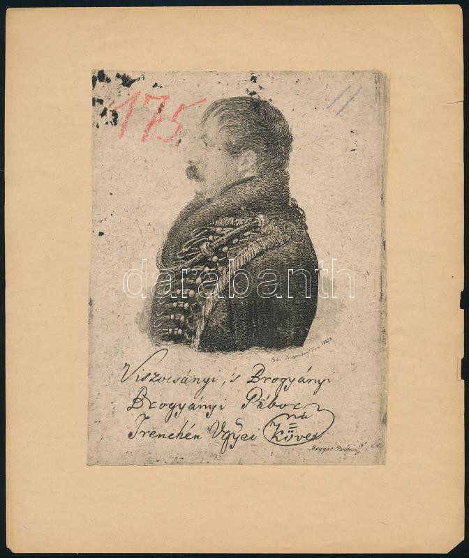 1827 Ferdinand von Lütgendorf-Leinburg (1785-1858): Brogyányi Gábor (1776-1851), Trencsén vármegye országgyűlési követének portréja. Rézmetszet, papír, jelzett a metszeten, papírlapra ragasztva, kissé foltos, 14,5x11 cm