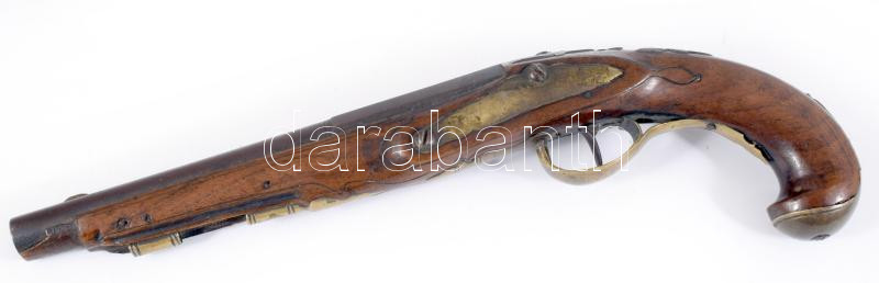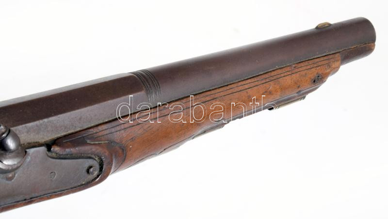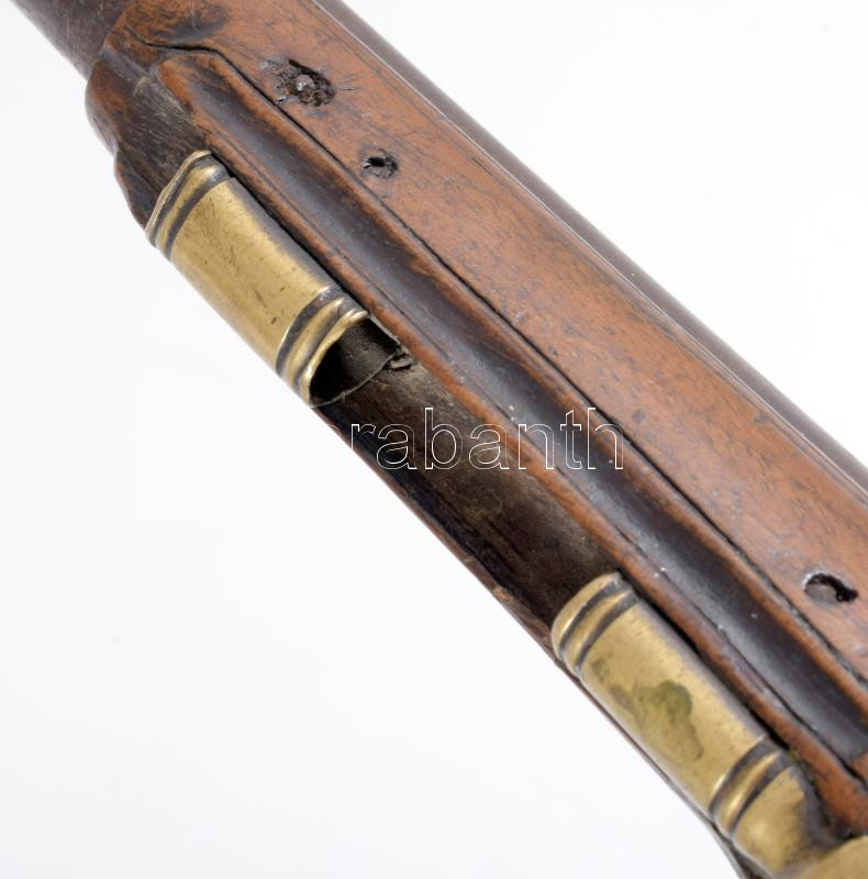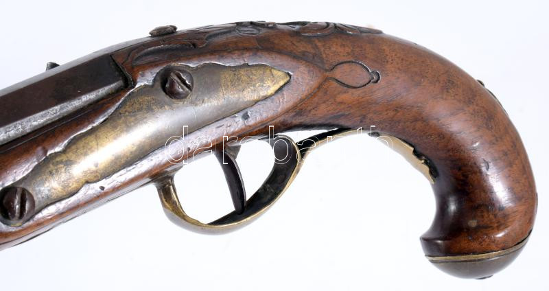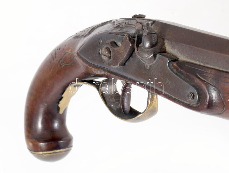 Főúri kovaköves pisztoly. cca 18. sz. második fele, feltehetően német, faragott diófa, bronz szerelék, fában monogrammal, töltővessző hiányzik, csappantyúja törött, h: 36,5 cm. Proveniencia: Haranghy Jenő festőművész gyűjteményéből.