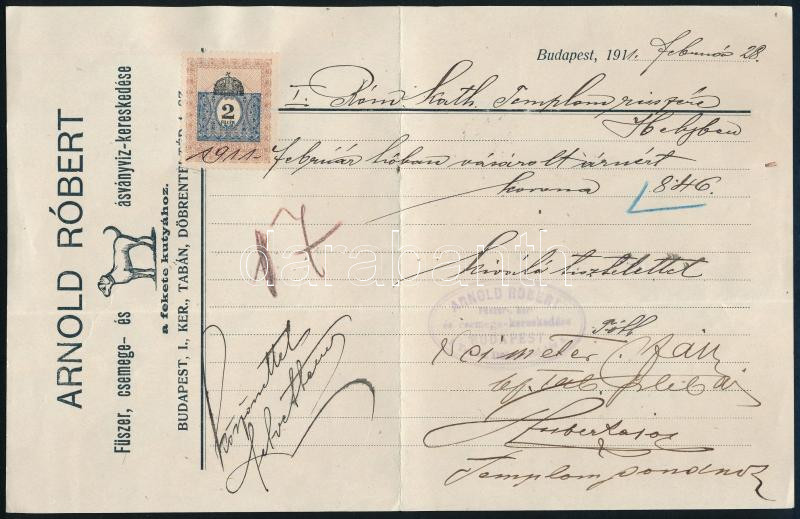 1911 "Arnold Róbert Fűszer, csemege- és ásványvíz-kereskedése a fekete kutyához" üzletének fejléces számlája, pecséttel, aláírással, 2f okmánybélyeggel.