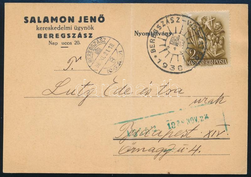 1938 Salamon Jenő beregszászi kereskedelmi ügynök levele, Szlovenszkó - Kárpátalja visszacsatolása után, a másik oldalán: ezen a területen milyen cégeket képvisel, "Beregszász visszatért" visszatérési bélyegzéssel,1938. nov. 22. dátum bélyegzéssel, jó állapotban.