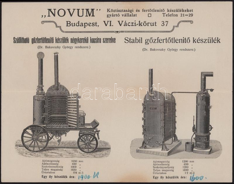 cca 1900-1910 "Novum" Köztisztasági és Fertőtlenító Készülékeket Gyártó Vállalat 2 db reklám prospektusa, hajtottak, az egyik foltos, a másikon kézzel írt árakkal, bejegyzéssel, 23x30 cm