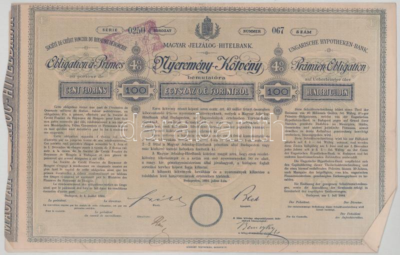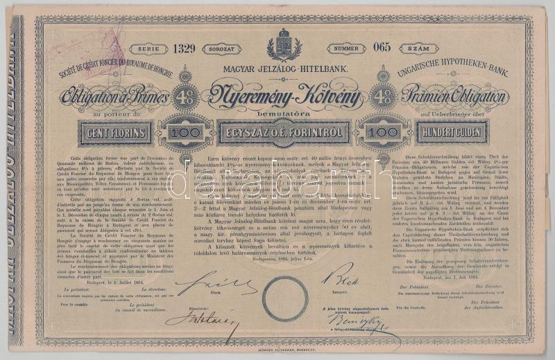 Budapest 1884. "Magyar Jelzálog-Hitelbank" nyeremény-kötvénye 100Ft-ról bélyegzéssel, szárazpecséttel (2x) T:F