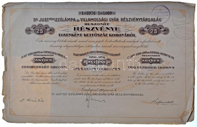 Budapest 1921. "Dr. Just-féle Izzólámpa és Villamossági Gyár Részvénytársaság" 25 részvénye egyben, egyenként 200K-ról, szelvényekkel magyar, francia és német nyelven T:VG