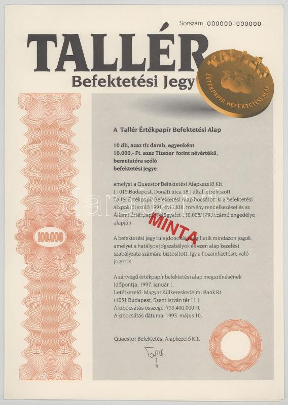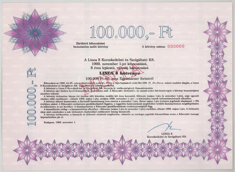 Budapest 1993. "Tallér Befektetési Jegy" 100.000Ft-ról, piros "MINTA" bélyegzéssel és "000"-ás sorszámmal + Budapest 1993. "Línea Kereskedelmi és Szolgálataó Kft." kötvénye 100.000Ft-ról, piros "MINTA" bélyegzéssel és "000"-ás sorszámmal T:AU