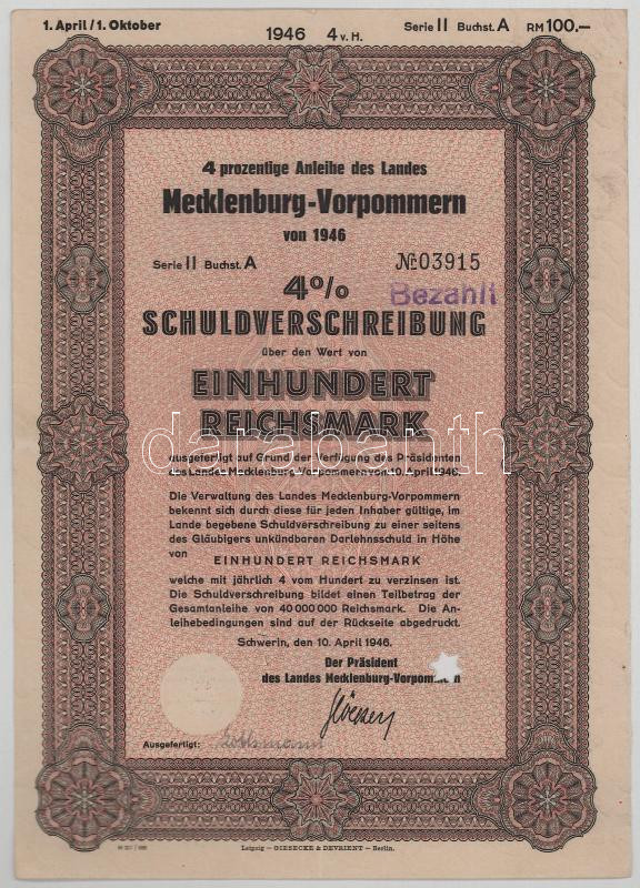 Német Birodalom / Szövetséges megszállás / Schwerin 1946. "4 prozentige Anleihe des Landes Mecklenburg-Vorpommern von 1946" kölcsön kötvény 100M-ról, bélyegzéssel és lyukasztással érvénytelenítve T:F