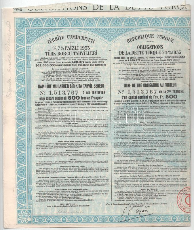 Törökország 1933. "7 1/2%-os Török Államadóssági kötvény, 1933, 2. és 3. sorozat" kötvény 500Fr-ról felülbélyegzésekkel, szelvényekkel (4x), közte sorszámkövetők, lyukasztással érvénytelenítve T:F Turkey 1933. "Turkish debt 7 1/2% bonds 1933, 2nd and 3rd series" bond about 500 Francs with overprints and coupons (4x), with sequential serials, cancelled by holes C:F