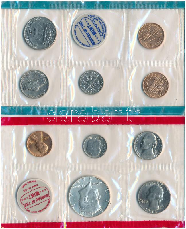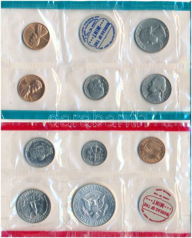 Amerikai Egyesült Államok 1968. 1c-1/4$ (5xklf) "San Francisco" zsetonnal, forgalmi sor lezárt fóliatokban + 1968D 1c-1/2$ (5xklf) "Denver" zsetonnal, benne 1/2$ Ag "Kennedy", forgalmi sor lezárt fóliatokban T:UNC,AU