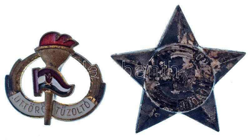 1970-1980 k. "Úttörő Tűzoltó" zománcozott fém jelvény és jelvény (2xklf) (22x24mm és 31x31mm) T:XF patina