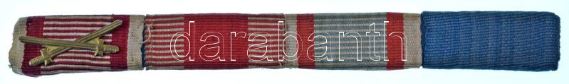 1940 k. Horthy-korszakból származó szalagsáv tétel, benne sorrendben: osztrák hadiszalag kardokkal, Károly Csapatkereszt, Magyar Háborús Emlékérem, Erdélyi részek felszabadulásának emlékére