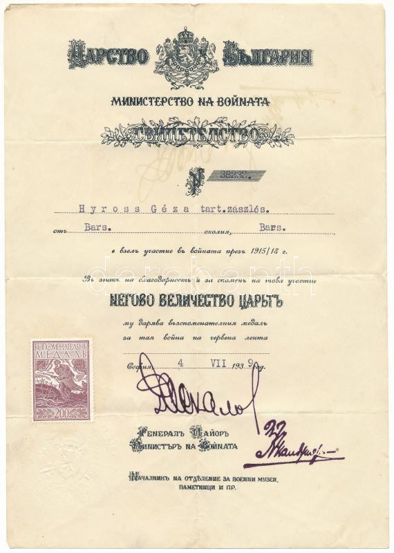 Bulgaria 1939. Awarding document of the "European War Commemorative Medal 1915-1918" C:XF,VF