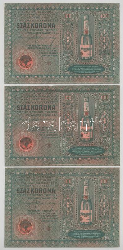 1913. május 1. Arad "Andrényi Kálmán Utódai" pezsgőreklám nyereményjáték felhívással 100K-ról (3x) T:XF-F hajtatlanok, de anyaghiány, folt, egyiken szakadások