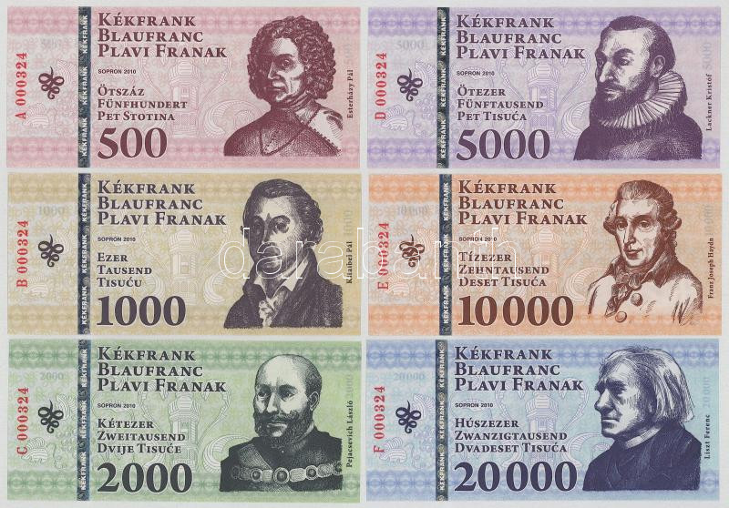 2010. Sopron 500 Kékfrank + 1000 Kékfrank + 2000 Kékfrank + 5000 Kékfrank + 10.000 Kékfrank + 20.000 Kékfrank, mind azonos "000324" sorszámmal, de eltérő sorozatjellel, teljes sor! T:UNC