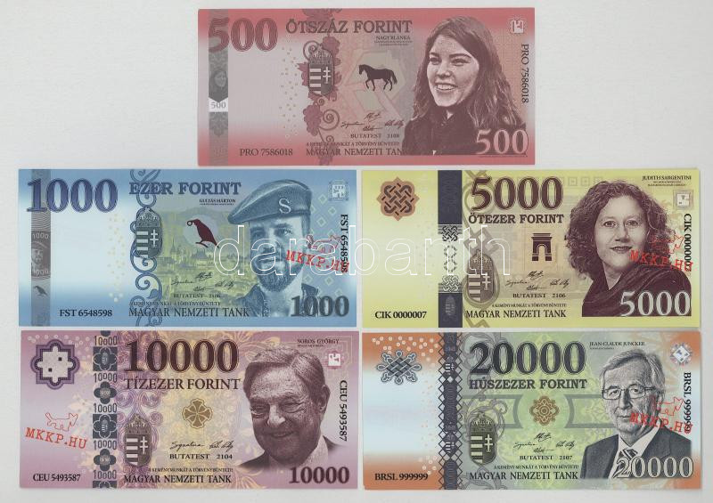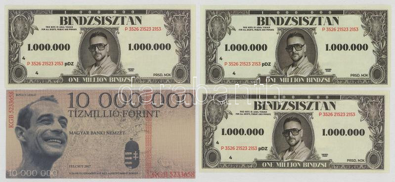 2018. 500Ft-20.000Ft (5xklf) "Soros pénz" fantázia bankjegyek + 2017. 10.000.000Ft "köszpénz" fantázia bankjegy az MKKP elnöke, Kovács Gergely arcképével + "Bindzsisztán" 1.000.000 Bindzsi Majka arcképével (3db) T:UNC,AU