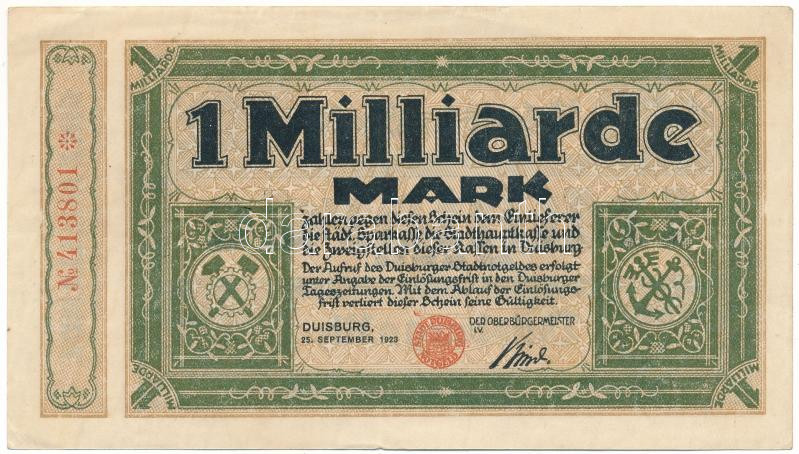 Németország / Weimari Köztársaság / Duisburg 1923. 1.000.000.000M T:F
