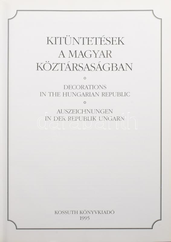 Zeidler Sándor: Kitüntetések a Magyar Köztársaságban. Bp., 1995, Kossuth. Magyar, angol és német nyelven. Kiadói egészbársony-kötés, szakadt papír védőborítóban.