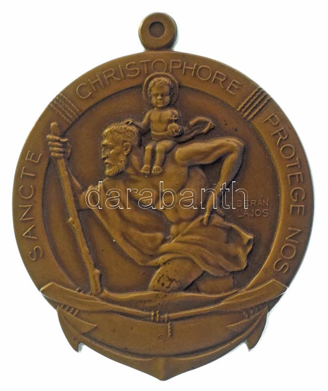 Berán Lajos (1882-1943) 1930 k. Szent Kristófot, az utazók, hajósok védőszentjét ábrázoló bronz hajójelvény átfúrás nélkül, hátoldalán "BERÁN N" gyártói jelzéssel, "SANCTE CHRISTOPHORE PROTEGE NOS (Szent Kristóf védj meg minket)" (76x63mm) T:AU / Hungary cca 1930. bronze ship ornamet without holes, depicting the patron saint of seaman and travelleres, with "BERÁN N" maker's mark. "SANCTE CHRISTOPHORE PROTEGE NOS (St. Christopher, protect us)" (76x63mm) C:AU