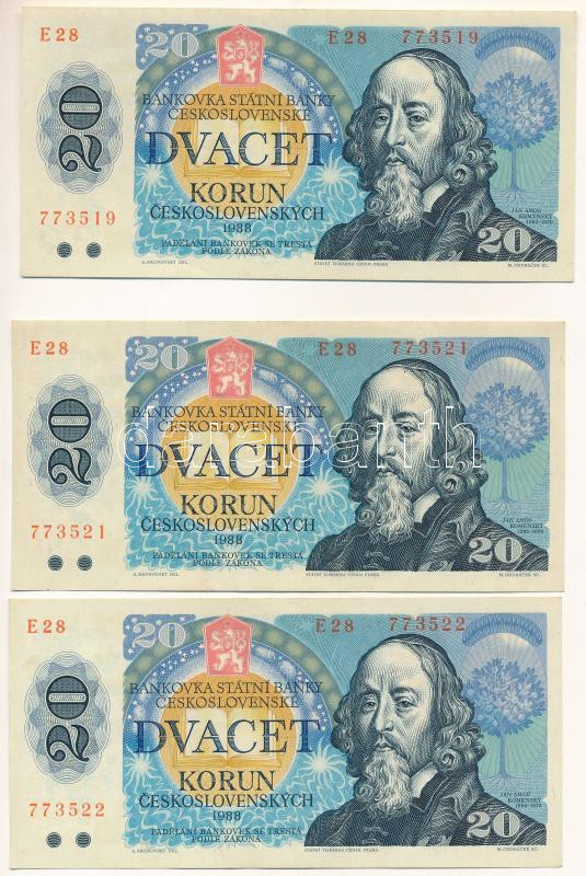 Csehszlovákia 1988. 20K 3db, 2x sorszámkövetők "E28 773521 - E28 773522" + közeli sorszám "E28 773519" T:VF-F szép papír