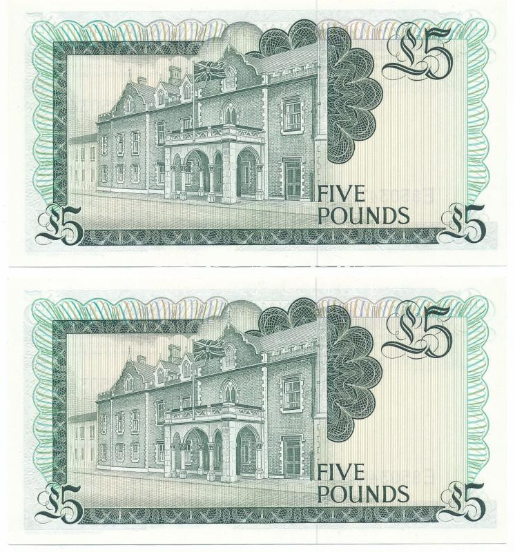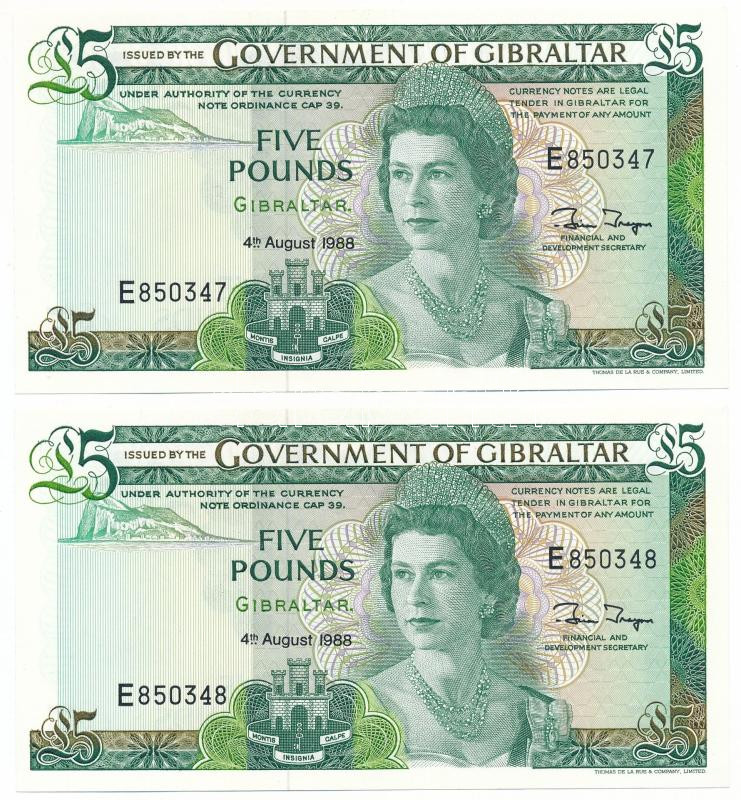 Gibraltar 1988. 5 Pounds (2x) consecutive serials "E850347 - E850348" C:UNC