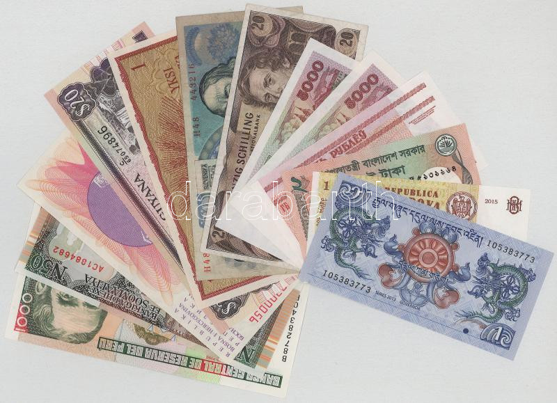 Vegyes, 13db-os külföldi bankjegytétel, benne: Banglades, Fehéroroszország, Moldova, Guyana, Bhután, Ngultrum, Csehszlovákia, Szomália, Peru, Finnország, Bosznia Hercegovina, Ausztria T:UNC-XF, közte két darab F