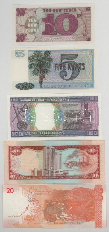 Vegyes 5db-os külföldi bankjegytétel: Nagy-Britannia / Katonai kiadás 1972. 10p "6. sorozat" + Mianmar / Burma DN(1973) 5K + Mauritánia 1989. 100O + Trinidad és Tobago 2006. 1D + Fülöp-szigetek 2016. 20P T:UNC-F