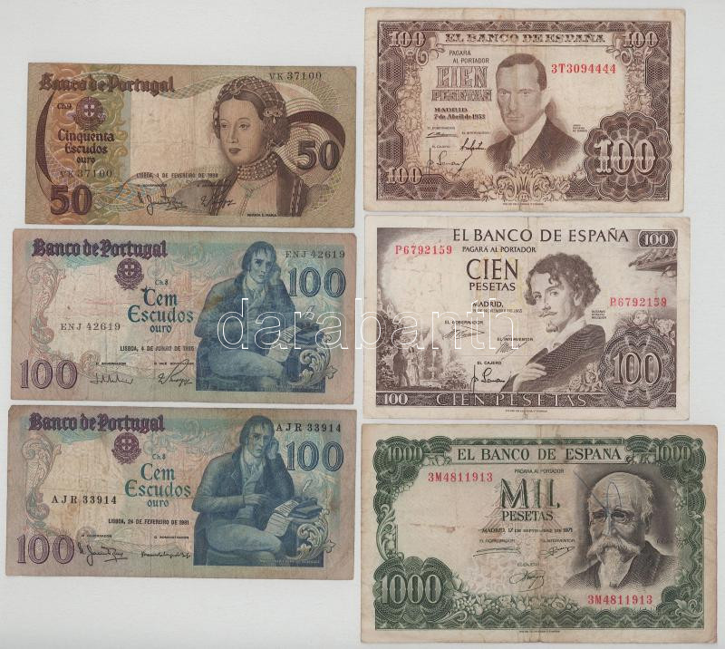 Vegyes, 6db-os bankjegytétel, benne: Portugália, Spanyolország 1953-1985. T:F-VG
