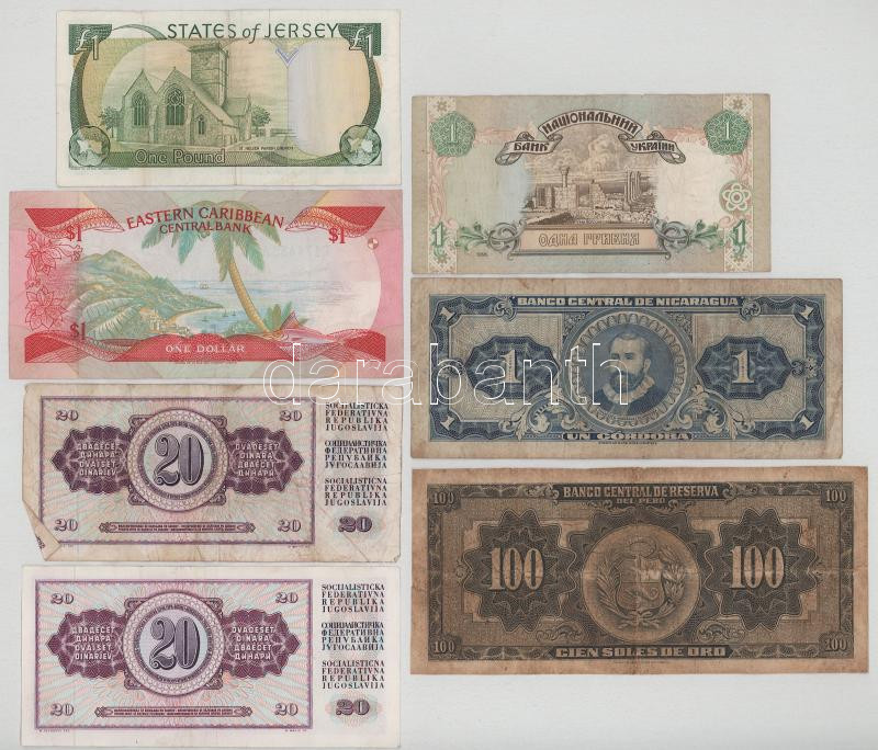 Vegyes, 7db-os bankjegytétel, benne: Peru, Nicaragua, Ukrajna, Jugoszlávia, Kelet-Karibi Államok, Jersey T:F-VG