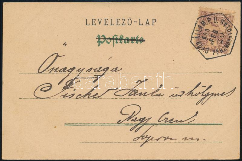 1900 Turul 4f litho képeslapon, "GYŐR ÁLLAM. P.U. / PÉNZROVATOLÁS" bélyegzéssel