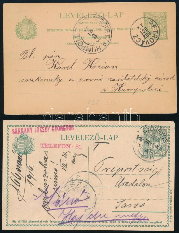 1902-1916 2 db díjjegyes levelezőlap "PETROVÁCZ" + "GYÖNGYÖS"