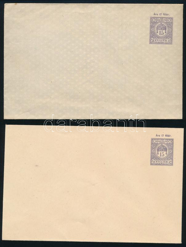 1917 2 db 15f használatlan boríték, sima és rombuszos rácsnyomással, kiváló állapotban (Hodobay 42a és 44aII)