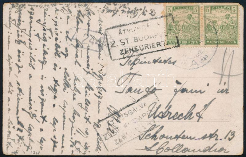 Beschreibung: 1918 Zsánerlap Arató 2x5f bérmentesítéssel Utrechtbe, cenzúrázva