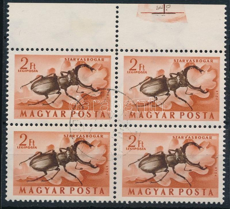 1954 Rovarok 2Ft ívszéli 4-es tömb, a jobb alsó bélyegen a v betű jobb oldali szára hosszú (7.000+)