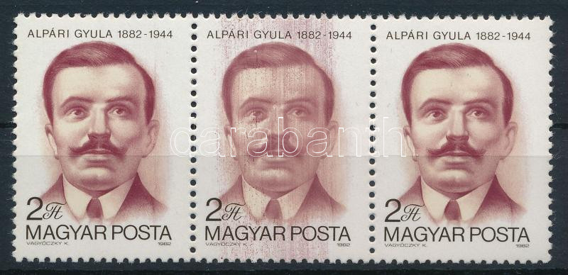 1982 Alpári Gyula 2Ft 3-as csík, a középső bélyeg látványos festékelkenődéssel