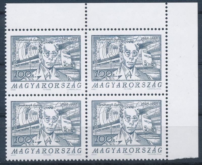 1998 Jendrassik György ívsarki 4-es tömb, a jobb felső bélyegen "a motorvonat tetején fehér folt" tévnyomat (4.400)