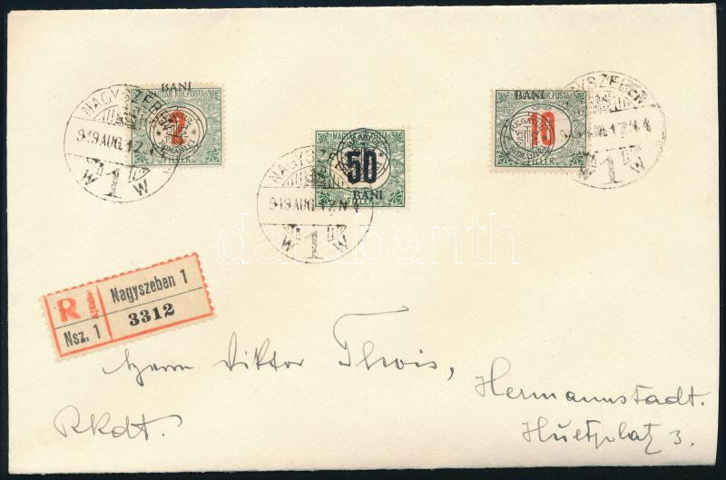 Kolozsvár 1919 Ajánlott nagyszebeni helyi levél Portó 2f, 10f, 50f bélyegekkel bérmentesítve. Certificate: Barabássy