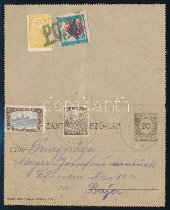 SHS 1921 Zárt levelezőlap Tolnáról a szerb megszállás alatt lévő Bajára küldve szabályosan bérmentesítve: 100f + Portó 5 Para és Lánctépő 45 Para bélyeggel, ezeken szürke színű PORTO felülnyomás, Bodor vizsgálójellel