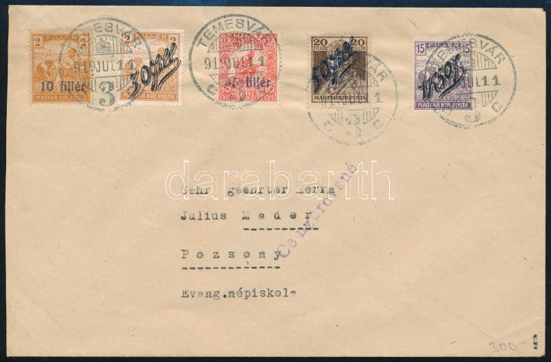 Temesvár 1919 Temesvárról Pozsonyba feladott levél a temesvári szerb kiadás 5 klf bélyegével túlbérmentesítve, csehszlovák cenzúra bélyegzéssel, Bodor vizsgálójellel