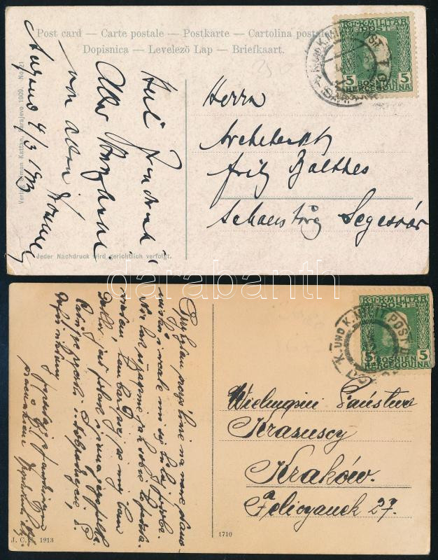 1913 2 db képes levelezőlap "K. UND K. MILIT. POST / DOBOJ" + "~ / SARAJEVO" bélyegzéssel
