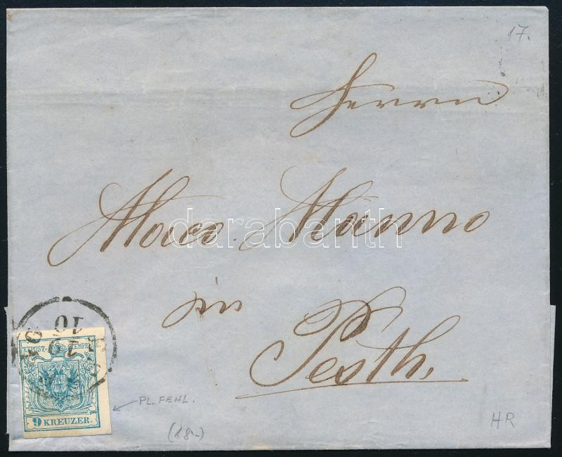 ~1855 9kr MP III.b 2x típ. világoskék, levélen "ESSEGG" - "PESTH / Früh"
