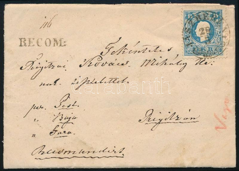 1859 15kr előoldalon + 10kr hátoldalon ajánlott levélen "JÁSZBERÉNY" - "CZEGLÉD" - "PESTH" - "BAJA"