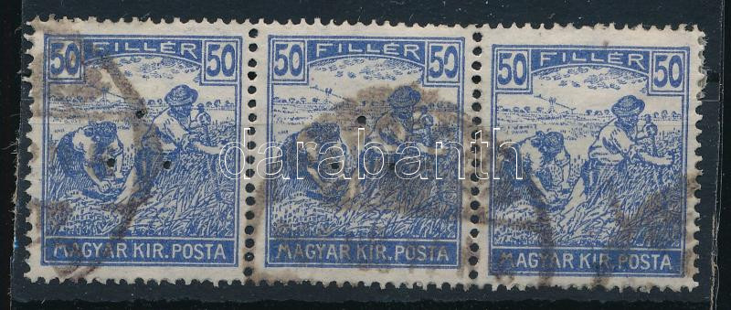 1920 Arató 20f 3-as csík, a bal oldali két bélyeg 3-as lyukasztással, a jobb oldali bélyegkép lejjebb van