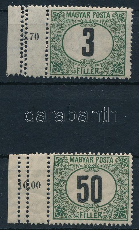 1920 Magyar Posta ívszéli 3f és 50f tripla fogazással