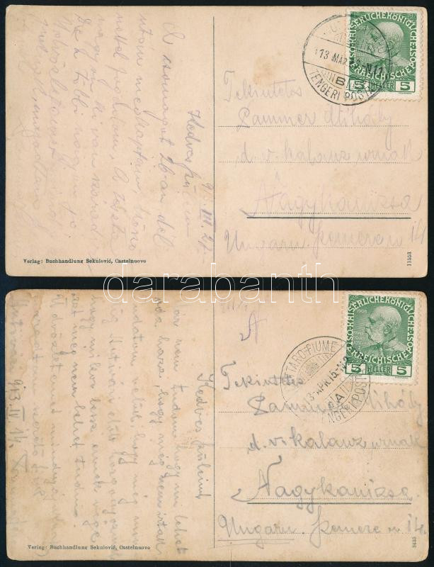 1913 2 db képeslap "CATTARO-FIUME / TENGERI POSTA" + "FIUME-CATTARO / TENGERI POSTA"