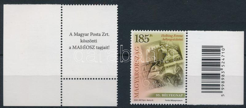 2020 Bélyegnap vonalkódos sor, a 135Ft "A Magyar Posta Zrt. köszönti a MABÉOSZ tagjait!" hátoldali felirattal