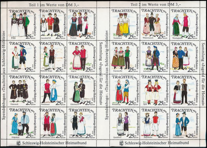 NSZK Schleswig-Holstein Népviseletek 24 különféle levélzáró teljes ívben, fogazási rendellenességgel