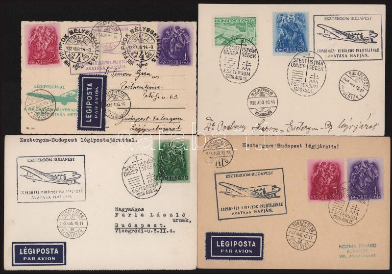 1938.08.15. 13 db légiposta levelezőlap "BUDAPEST-ESZTERGOM ÁRPÁDHÁZI KIRÁLYOK PALOTÁJÁNAK AVATÁSA NAPJÁN" alkalmi bélyegzéssel és levélzárókkal