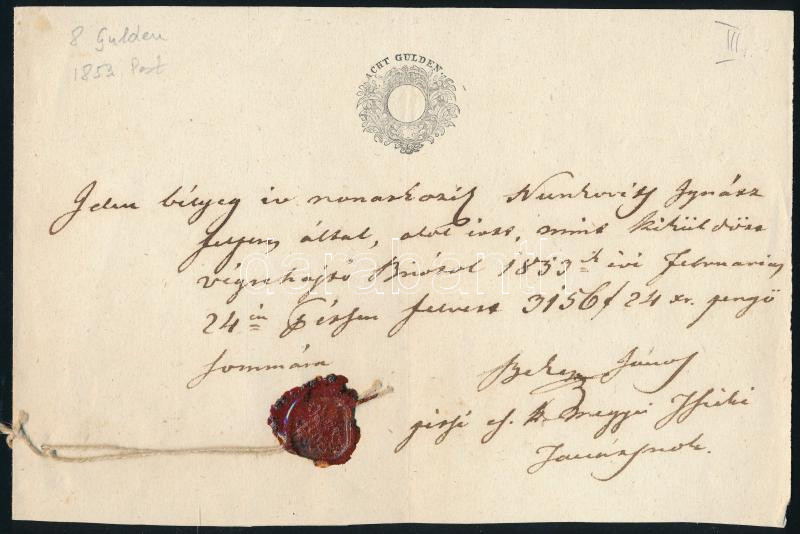 1853 Pest, nyugta 8G (8 Gulden) szignettával, címeres viaszpecséttel