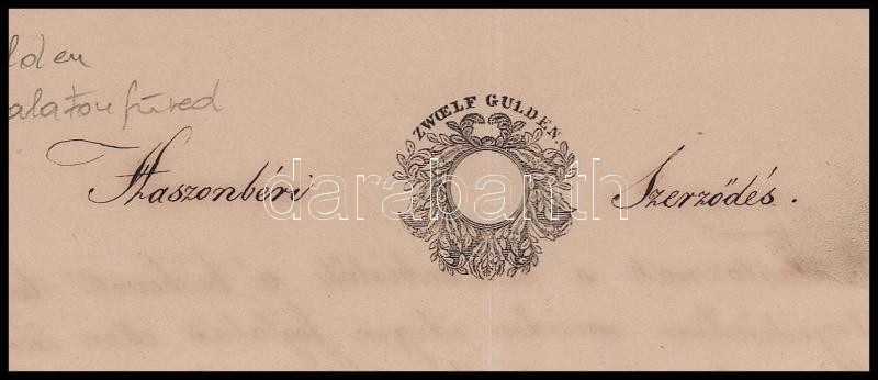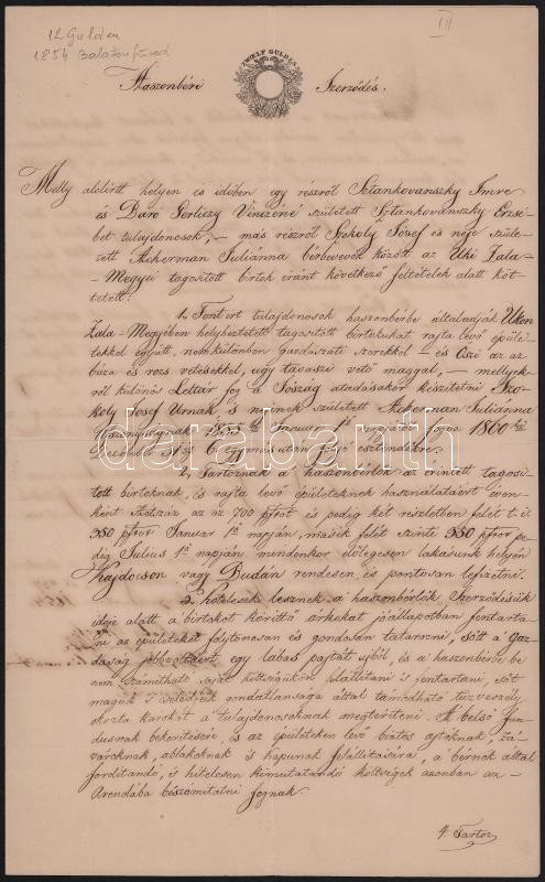 1854 Balatonfüred, haszonbéri szerződés 12G (12 Gulden) szignettával