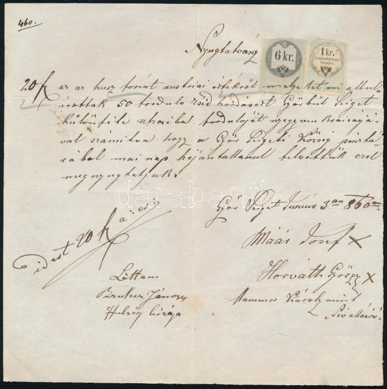 1860 Győrsziget, nyugtatvány 6kr okmánybélyeggel + 1kr hirdetménybélyeggel