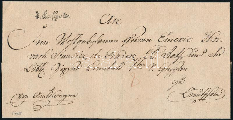 1788 Bélyeg előtti félportós levél gótikus, jól olvasható "v.CASCHAU" bélyegzéssel Lőcsére, 8kr félportóval (Rompes 100 p)