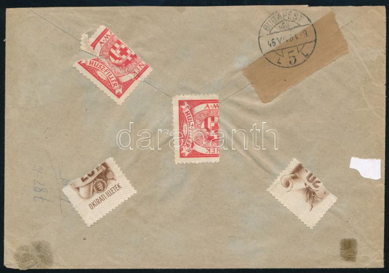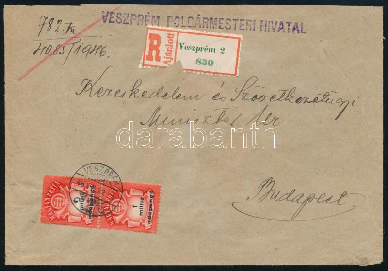 1946 (27. díjszabás) Ajánlott levél 1 millió AP párral bérmentesítve / Mi 941 pair on registered cover "VESZPRÉM" - Budapest